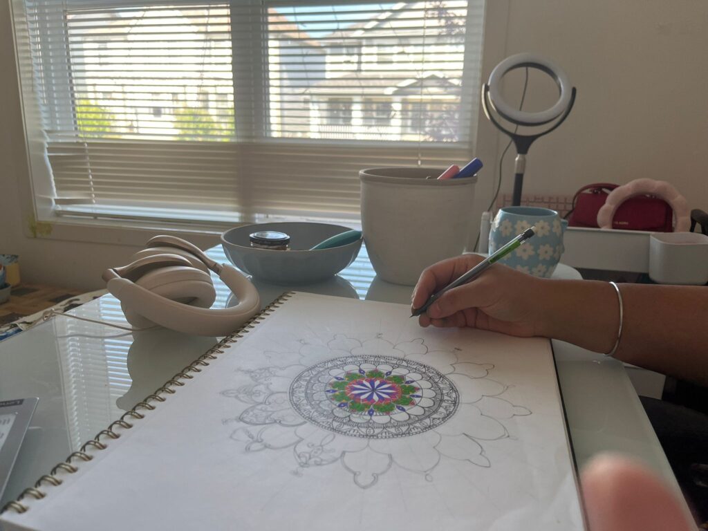It was 1:30 pm, and I was sitting at my desk in my little home studio. Out of nowhere, I felt this deep craving to create again. It had been a while since I’d picked up my compass and ruler, but when I stumbled across my big A3 art file, something stirred inside me. There it was—an old Mandala, half-done, partly colored, waiting quietly. The center simply called me in.
